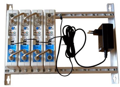KIT ALCAD HOTEL sestává ze dvou kusů transmodulátorů TMS-214, napájecího zdroje a montážního rámu na zeď.